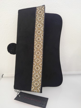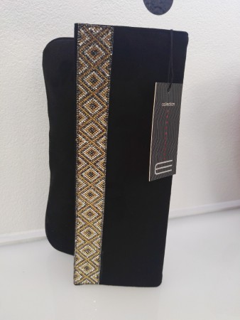 Bolso negro con cristales brillantes, ideal para tus fiestas y eventos, facil de combinar.